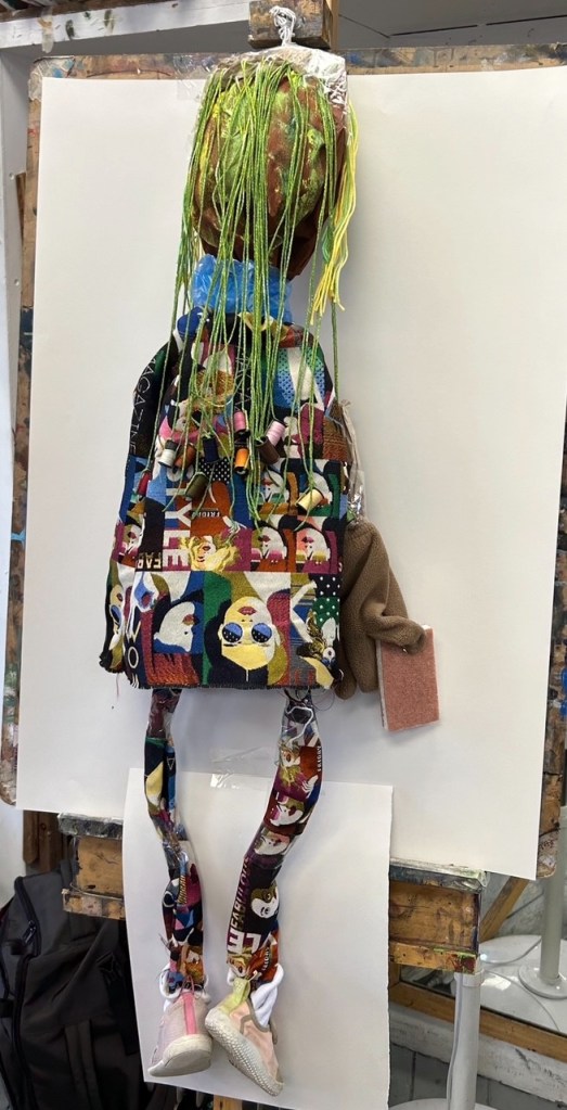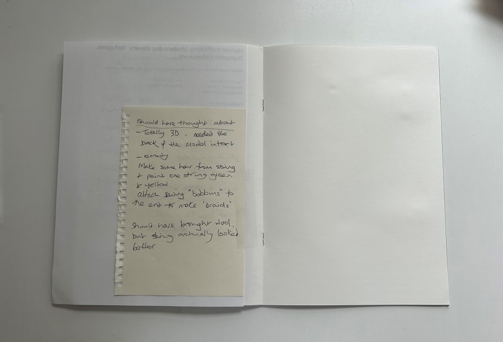 The hair need to be green & yellow, fortunately I had string with me, I cut and painted lengths of string to make more hair, and having taken my sewing kit to the lesson I could utilise some small bobbins of cotton to make the hair braids, giving the final version a totally 3D model.