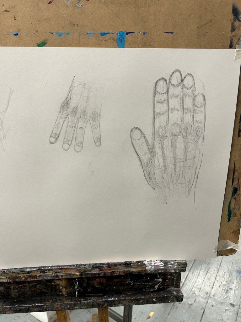 After the technicalities or hands and feet were explained the task seemed less daunting. The smaller hand is a copy of Kit’s pose, the larger one a copy of my own hand.