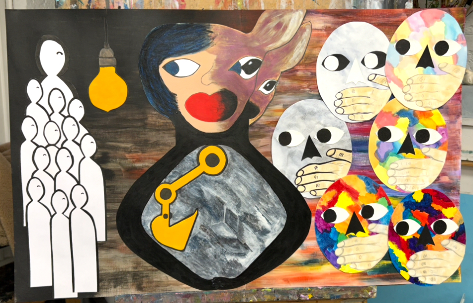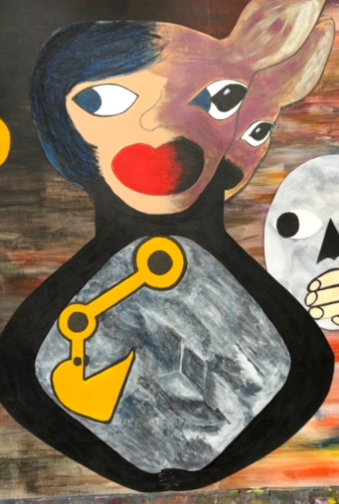 In the central section of the painting the image shows a digger and ‘rubble’, taken from the story of the Terracotta Army in China, where the warriors were discovered in a destroyed state. It represents the destruction of the lives of the girls.