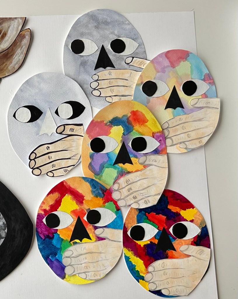 Initially I decided to create the female heads using a zentangle approach but the end result was too busy to have multiple heads with so much detail. I then used watercolour to create a series of heads that started colourful and eventually ended up a very pale grey. This approach was to portray the girl’s lives being taken from them. Where there may have been joy and happiness (colour) it would be stripped from them as they were sold into this hidden world of abuse. The hands over the mouths are silencing the girls, significant in that victims of abuse have no voice.