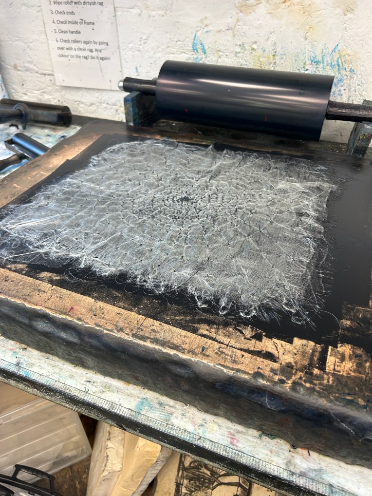 I made the decision to ink the material directly and then roller some excess ink off onto tissue paper.
