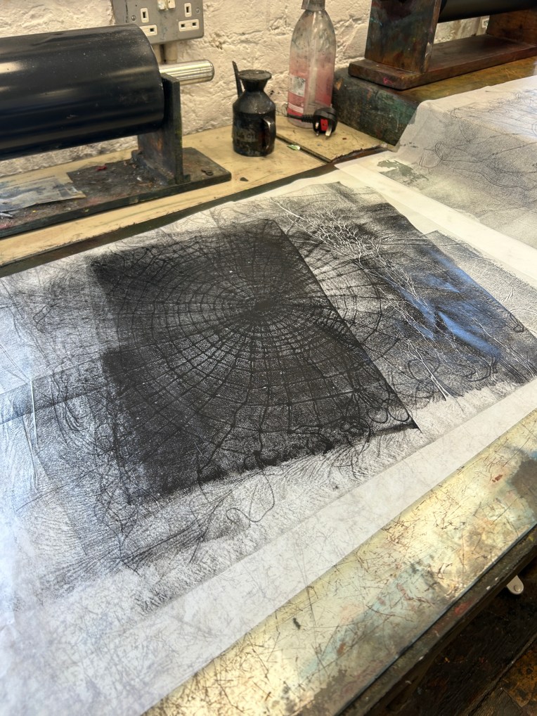 I decided to concentrate on the artwork that would appear behind the hanging piece to take advantage of the sessions in the printmaking studio