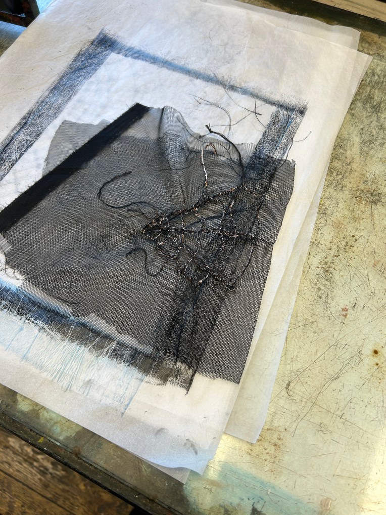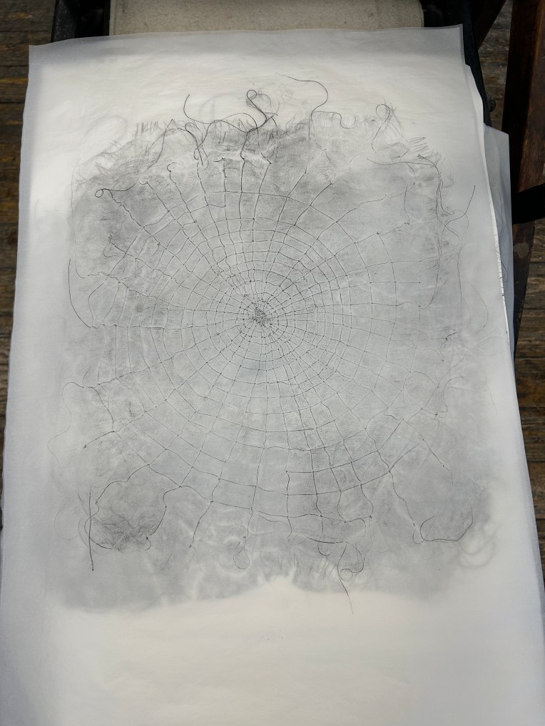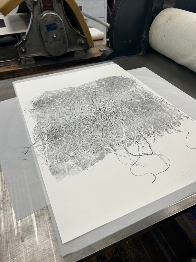 Interesting outcome. I reused some tissue paper that I thought was blank to protect the press. The impression already made on the used paper was imprinted on the new image.