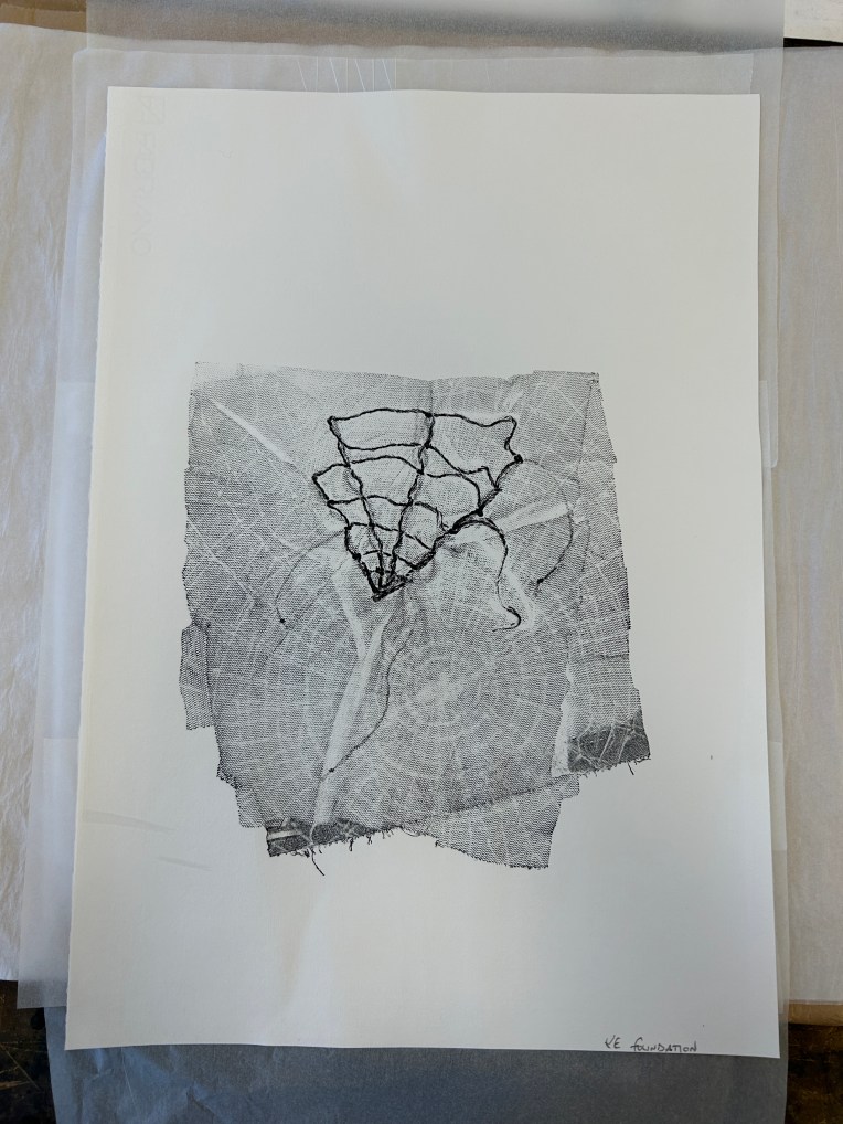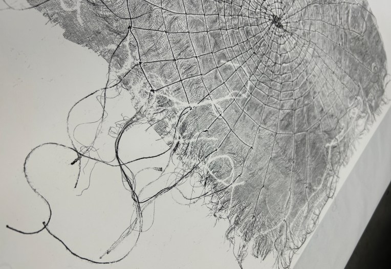 Having made my first attempts with the printmaking process I revised my plans. I still wanted to use a large scale hanging section but needed a new idea for the artwork behind it, and a revised idea for the hanging section.