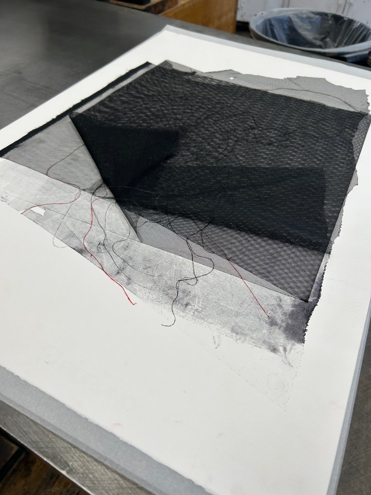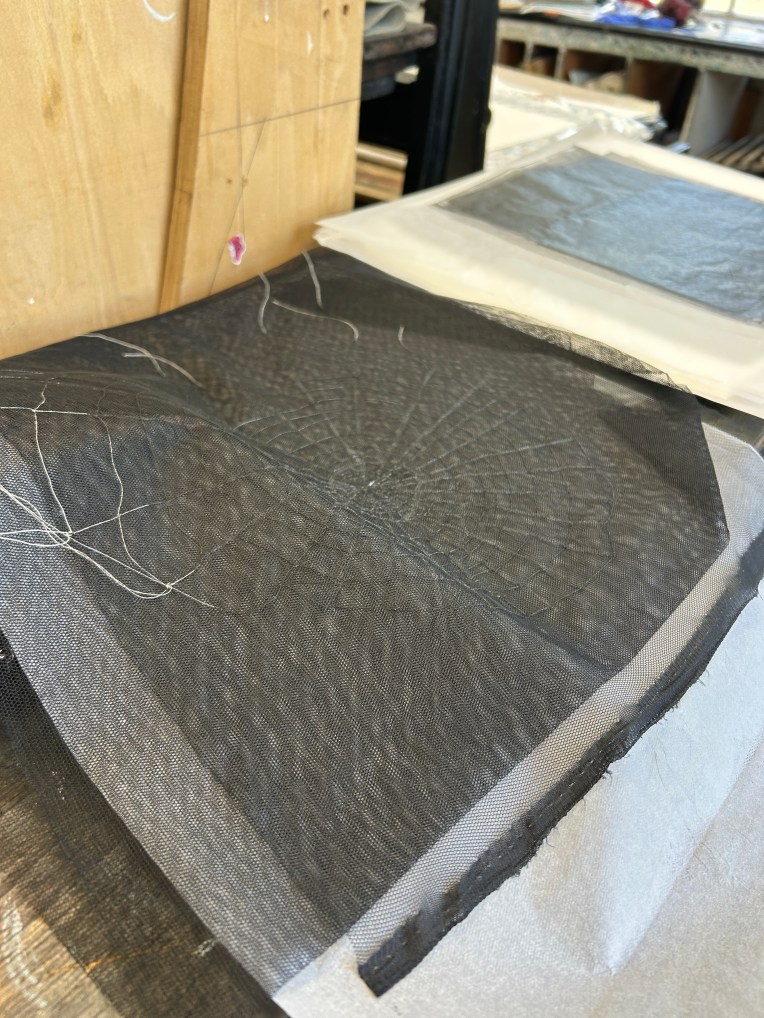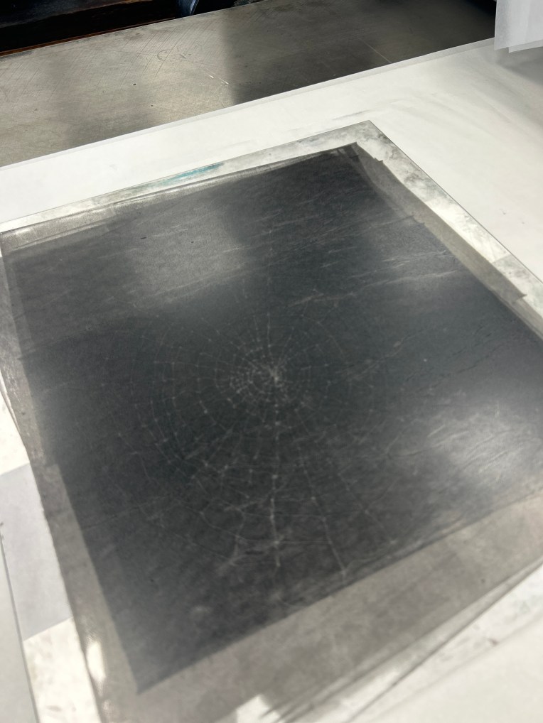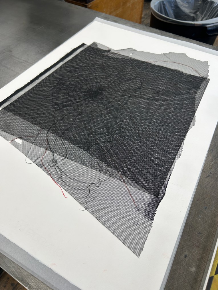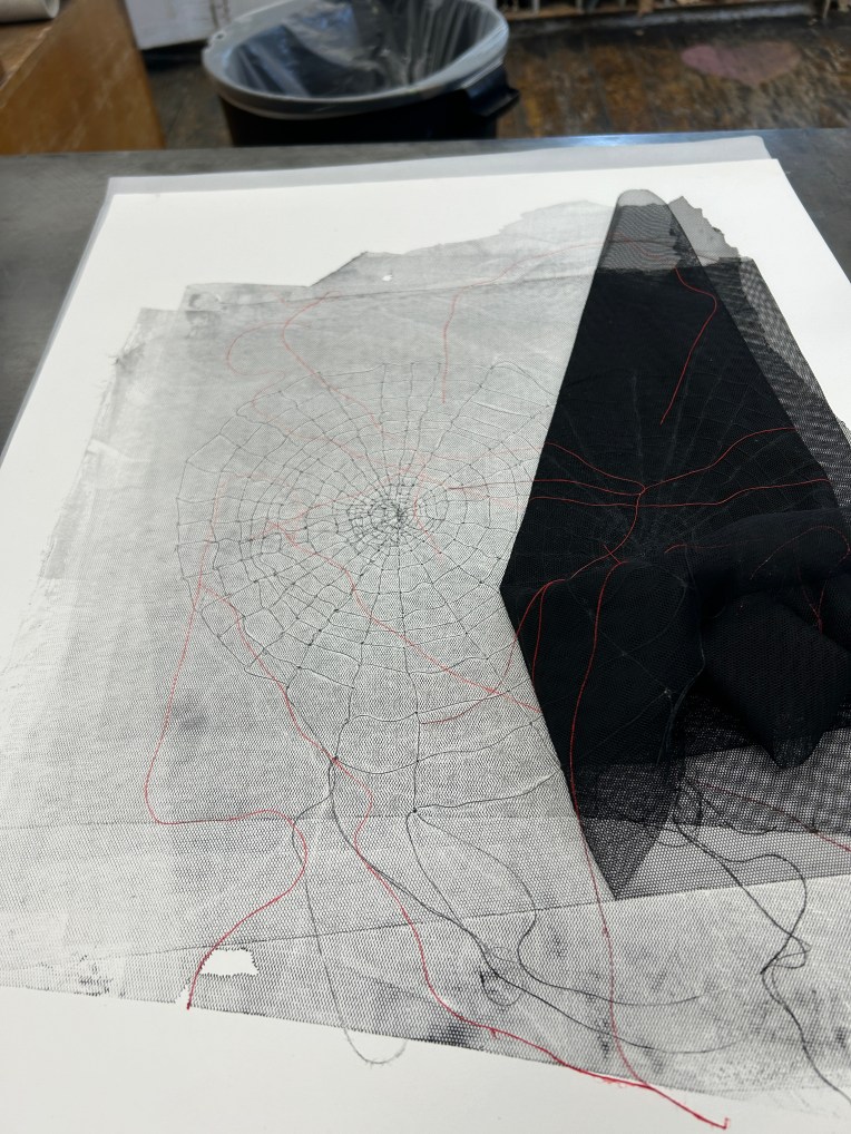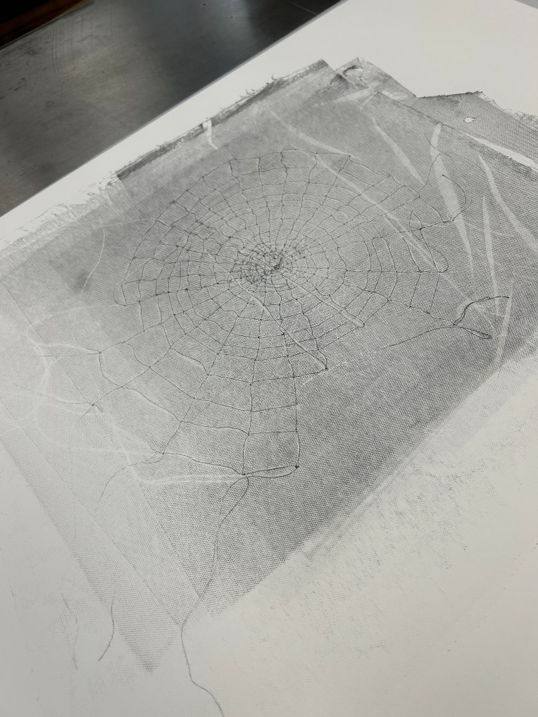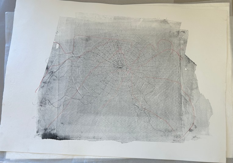 One of my ideas for the show was large hanging pieces of thin material with spider’s webs printed on it. I tried using the ‘successful’ process of directly inking the plate and printing onto material. Extremely unsuccessful. A major rethink of project ideas required.