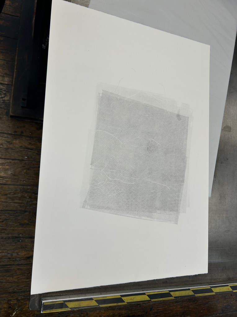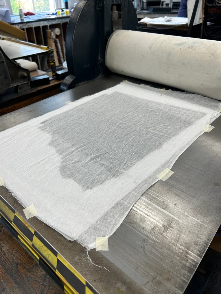 First I tried inking a plate, putting the clean material onto the plate and through the press to transfer ink to the material. The end result on the plate was interesting but not transferrable to tissue or paper.