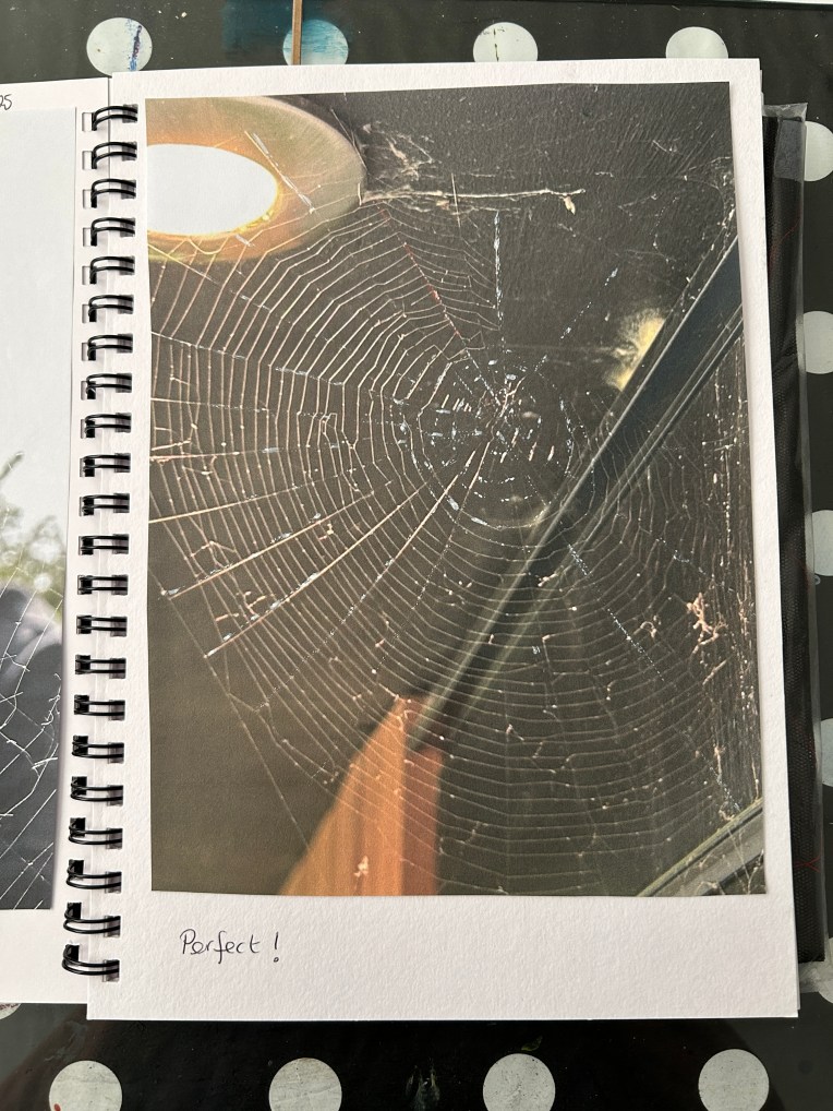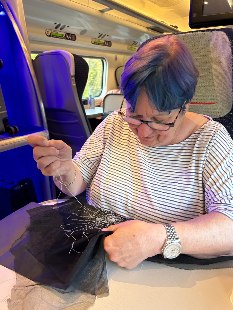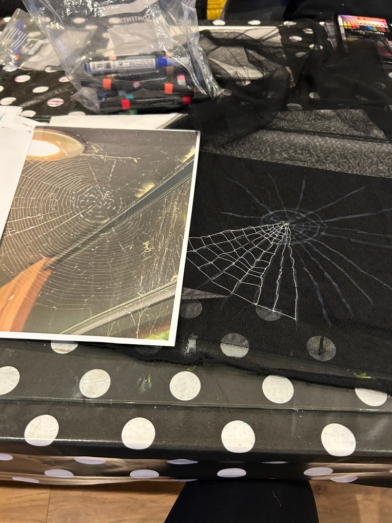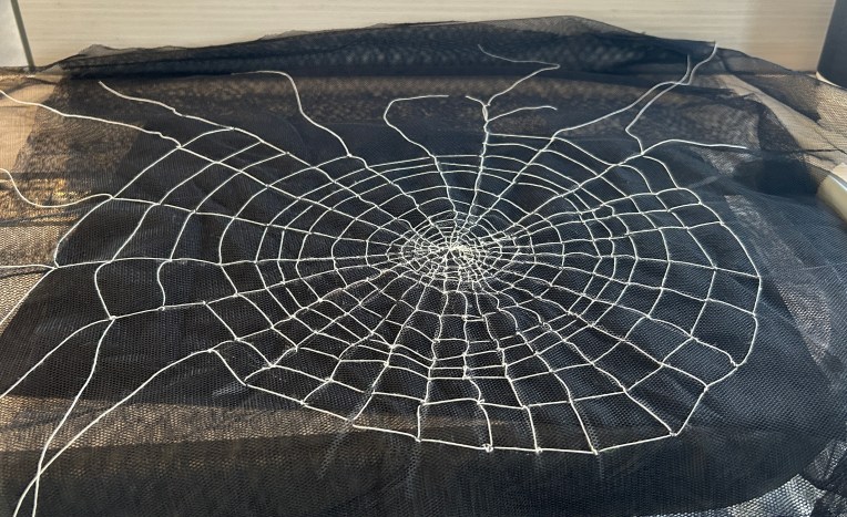 I first traced the web onto the material with tailor’s chalk and then used contrasting colour of stitching to sew the web. The initial attempt involved stitching each small section before moving to the next. This was very time consuming and not quite the result I was looking to achieve. I then made the decision to stitch the long star shape before using a ‘spinning technique’ similar to the actual spider’s method. Again trial and error eventually made the final decision about the stitching teqnique. Each joint needed a small back stitch to keep the web looking geometric.