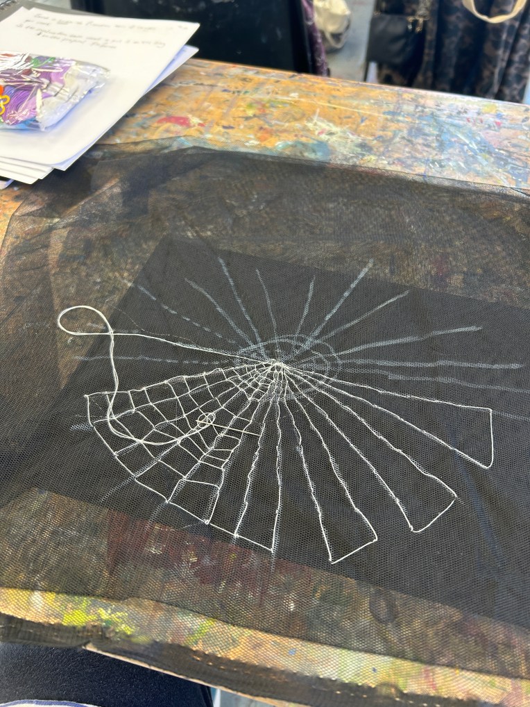 Using the photo of the spiders web with some thin gauze material I decided to hand stich a web onto the material.