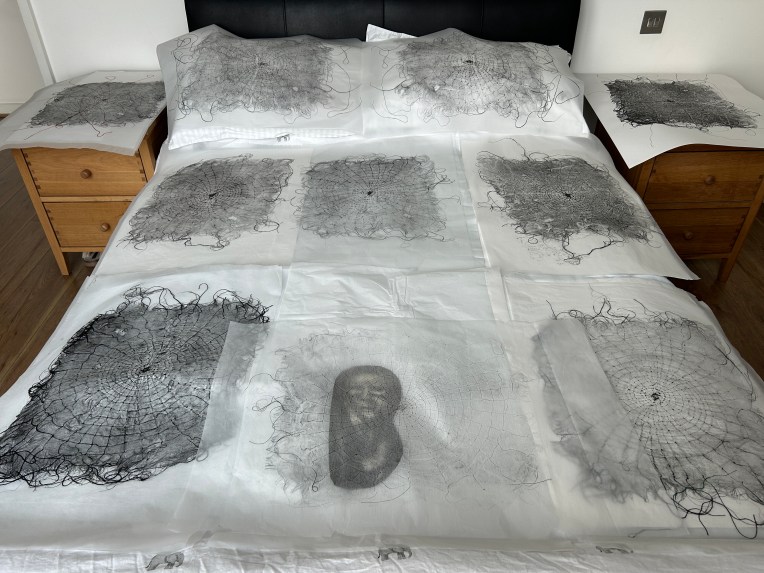 I used the printmaking sessions to produce a number of sample webs printed onto tissue paper of different intensities and depth of colour. This also produced some brilliant prints of webs on standard paper. I may use one of these in the exhibition.
