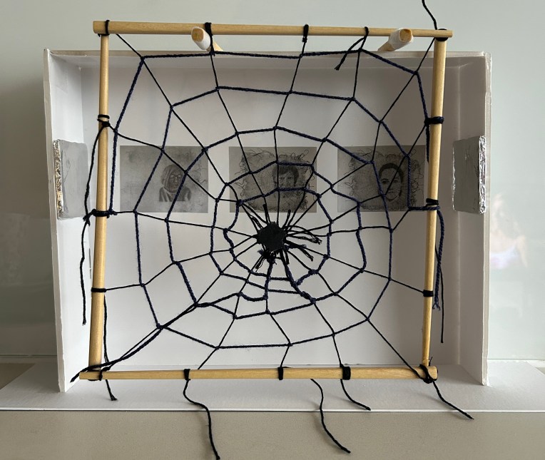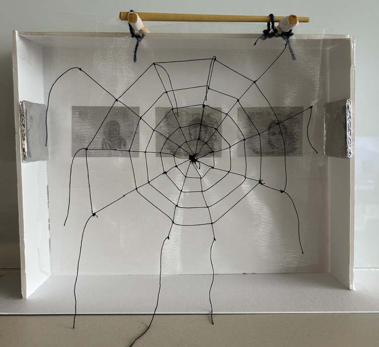I will produce 2 separate hanging systems that incorporated spider’s webs. The webs need to be transparent enough to see the three prints in enough detail to entice the viewer to venture behind it and look at the pictures of the webs.